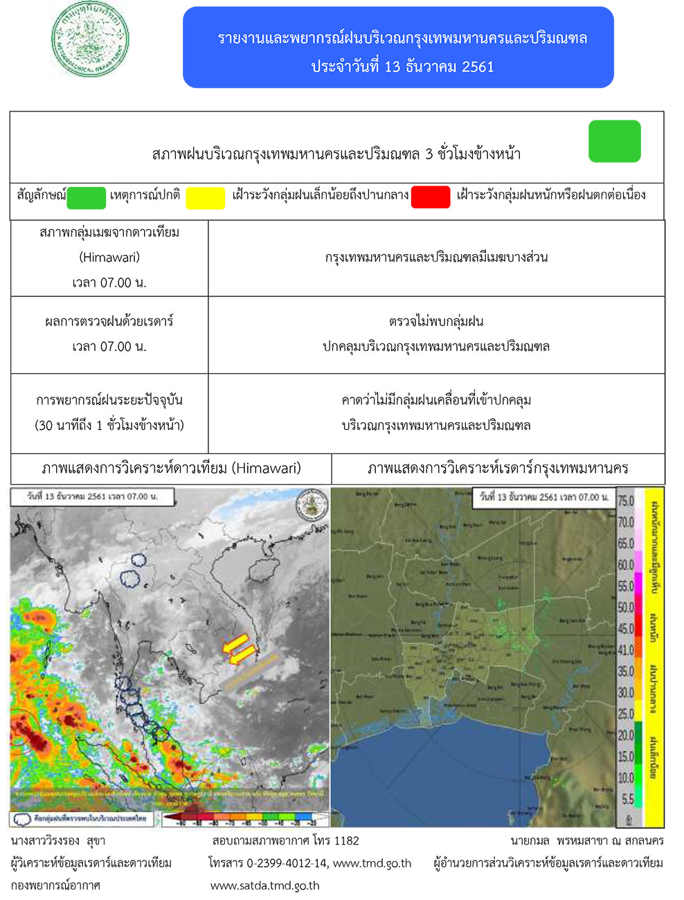 พยากรณ์อากาศ ประจำวัพฤหัสบดีที่ 13 ธันวาคม 2561 สมุทรสงคราม 07.00 - 16.00 น.มีเมฆเล็กน้อย - ท้องฟ้ามีเฆมมาก.. Ban Bang Kaeo 22°C มีเมฆเล็กน้อย...**... สำหรับภาคกลาง มีเมฆเป็นส่วนมาก อุณหภูมิจะลดลง 1-2 องศาเซลเซียส กับมีลมแรง โดยมีฝนฟ้าคะนอง ร้อยละ 20 ของพื้นที่ ส่วนมากบริเวณจังหวัดสมุทรสาคร สมุทรสงคราม ราชบุรี นครปฐม พระนครศรีอยุธยา และสระบุรี อุณหภูมิต่ำสุด 22-24 องศาเซลเซียส อุณหภูมิสูงสุด 31-33 องศาเซลเซียส